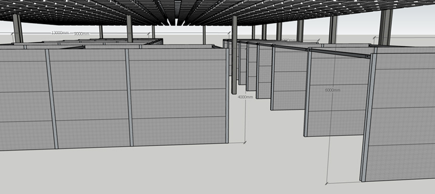 7、頂部吸聲系統(tǒng)通過轉換層安裝在頂部,下吊總高度1.5米,吸聲系統(tǒng)采用600*1200*100吸聲模塊,吸聲模塊均勻分布在頂部空間,可以有效的吸聲降噪。